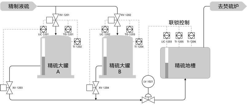 精硫作為裝置生產的原料,為確保原料供應的穩定性和精硫罐的可靠性,通常會設計兩個精硫大罐用于儲存精制液硫。精硫大罐的容量根據裝置規模和儲存時間確定,基本的儲存時間應滿足15至30天的用量需求。根據精硫的儲存時間差,大罐還可以通過物理沉降的方式,使液硫中的雜質進一步沉淀至罐底,從而減少系統中的灰分含量。因此,實現精硫大罐的自動倒罐和罐、槽液位的自動控制顯得尤為重要。為此,我們專門設計了精硫大罐自動控制方案。