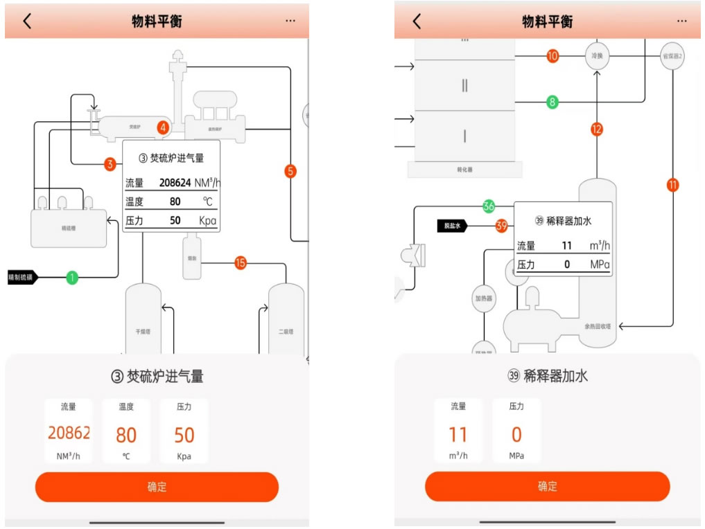 由于硫酸行業上手較難,其工藝過程具有管線復雜、儀表繁多等難點,并且在計算硫酸過程數據時,需要大量諸如水汽、硫、硫酸的粘度、電導率等相關數據,這在一定程度上導致工作效率低、同時由于數據不準確造成了消耗成本的增加,導致企業的經濟效益變差,數字化轉型的進度也難以提升。 面向硫酸行業的專業工作者和新入職的人員,數字硫酸APP為其提供全面的工藝模擬和便捷的參數查詢功能,以協助老手更高效地開展工作、新手更快速地熟悉業務流程。此外,數字硫酸APP軟件還可以對硫磺制酸的過程進行物料工藝計算,展現出硫酸制酸的工藝流程圖,根據用戶輸入的數據構建相應的數學模型,使用物料平衡功能模擬得到的設計標準數據與運行數據比對,實時發現運行差值與潛在問題及時調整工藝參數,且畫面中也會顯示出不同點位數據參數,在硫磺制酸裝置的正常運行中各點位會以綠色為標志顯示出裝置的正常運行狀態,當裝置各點位出現問題時會以紅色為標記顯示,可以隨時提醒工作人員做好記錄和檢查狀況。