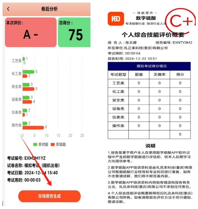 在模擬考試中,我們采用系統隨機抽取試卷的方式,將測試題目類型分為單選、多選、判斷和填空,并要求員工在有限時間內完成所有題目,最后提交試卷即可得出總分數。在界面末端的 “在線報告生成中”,可以清晰的反應員工個人對不同類型題目的答題情況,并生成員工“個人綜合技能評估表”。