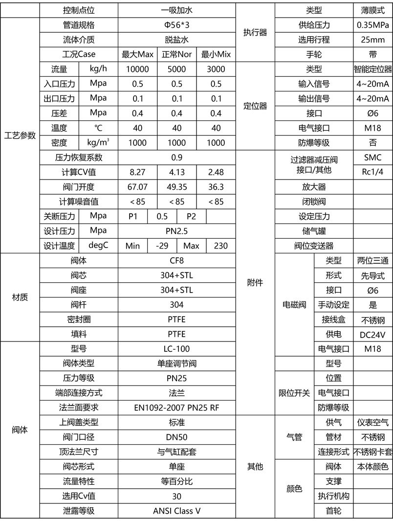 是調(diào)節(jié)閥導(dǎo)致硫酸濃度無(wú)法投自動(dòng)主要原因是調(diào)節(jié)閥選型不當(dāng)所導(dǎo)致,要選擇好符合裝置調(diào)節(jié)性的調(diào)節(jié)閥,必須清楚各個(gè)調(diào)節(jié)閥工藝參數(shù)和調(diào)節(jié)閥性能參數(shù)。下面是400Kt/a推薦的調(diào)節(jié)閥選型參數(shù)表。需要其他裝置規(guī)模加水調(diào)節(jié)閥選型參數(shù)表請(qǐng)聯(lián)系我們。我們竭誠(chéng)向您免費(fèi)提供。