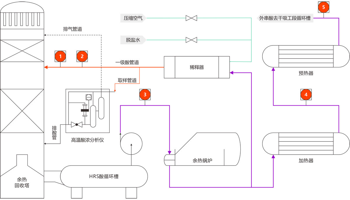 這些設(shè)備適用于多種測量位置,包括制水再生、干燥酸濃度測量、一吸酸濃度測量、二吸酸濃度測量、成品酸濃度測量以及余熱回收系統(tǒng)中的酸濃度測量。
