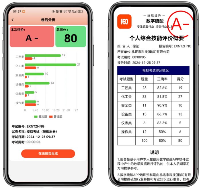 在模擬考試過程中,我們采用系統(tǒng)隨機(jī)抽取試卷的方式,將測試題目類型劃分為單選題、多選題、判斷題和填空題。考生需在規(guī)定的時間內(nèi)完成所有題目,并提交試卷以計算總分。點擊“在線報告生成”按鈕后,即可生成“個人綜合技能成績表”。