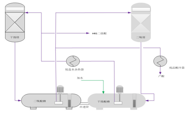 把除氧器原始溫度從104℃調整到135℃,余熱鍋爐產汽壓力從3.82MPa提升到6.4MPa,經初步估算可得,整個裝置中壓產汽率從1.2t/t酸可提高到1.3t/t酸,6.4MPa蒸汽也增大了發電機的發電效率。干吸流程中,干燥酸通過脫鹽水預熱器換熱后進入干燥塔,干燥下塔酸通過二吸泵直接進入二吸塔吸收,吸收后的酸進入干燥循環槽,二吸不設置酸冷器,循環酸槽之間設串通管平衡兩槽液位。如下圖所示