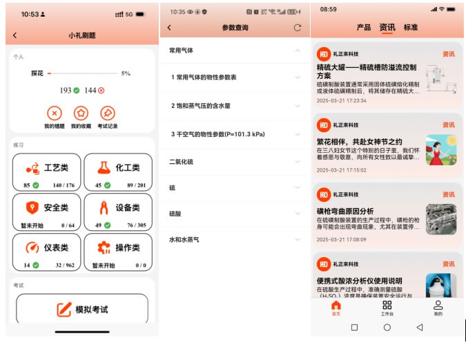 本篇主要介紹數字硫酸APP中已上線的各項功能,包括咨詢平臺、小禮刷題模塊、行業標準查詢工具以及物性參數查詢工具的使用方法。