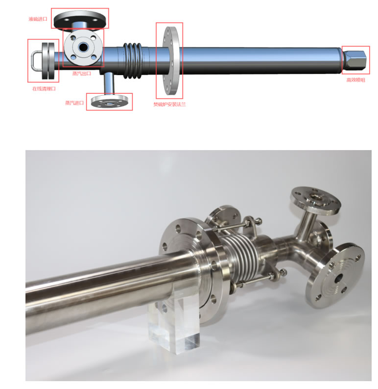 磺槍安裝在焚硫爐內(nèi)時(shí),槍身會(huì)因高溫炙烤而發(fā)生金屬材料的膨脹。槍身采用310S不銹鋼材料,在運(yùn)行期間與停車(chē)后的溫差可達(dá)約500℃。根據(jù)膨脹公式計(jì)算,停車(chē)后槍身的膨脹量約為10至15毫米。如果槍身內(nèi)部的保溫蒸汽分布不均勻,將導(dǎo)致槍身上下兩側(cè)的溫度存在差異,從而引起膨脹量的不同,最終造成槍身向上彎曲的現(xiàn)象。為此,我們自主研發(fā)了槍身均溫技術(shù)。該技術(shù)能夠確?;菢屧诜倭驙t運(yùn)行或停車(chē)狀態(tài)下,槍身上下溫度保持一致,膨脹量相同,從而有效解決了槍身彎曲的問(wèn)題。
