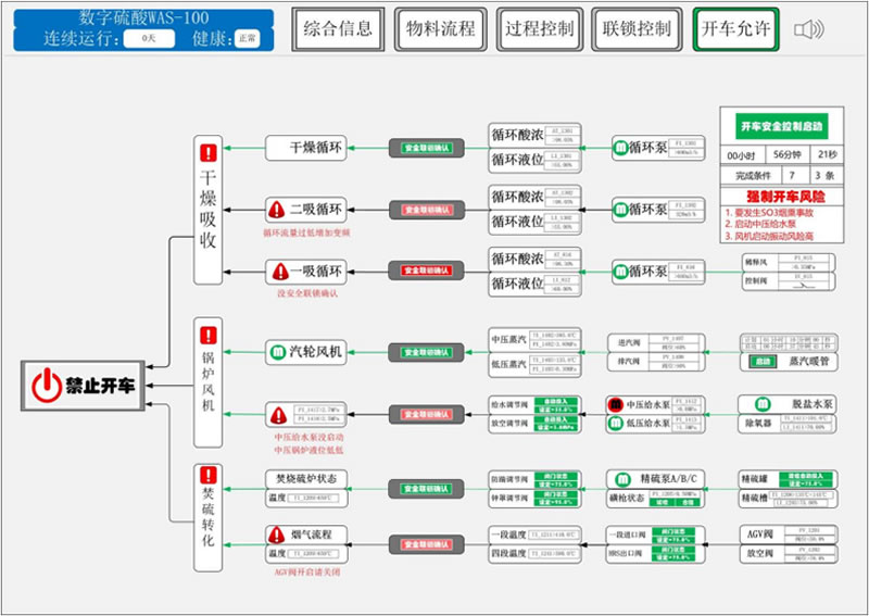 在啟動硫磺制酸裝置的過程中,由于工藝參數未達標、閥門設置不當或檢查不充分,經常會發生生產、安全和環保方面的事故。這些事故包括“升華硫、水擊蒸汽爆管、煙熏、稀酸腐蝕”等嚴重問題,給企業帶來巨大的經濟損失和負面社會影響。隨著硫酸裝置自動化水平的提高和長期穩定運行,生產操作人員對裝置的操作技能和應急響應能力有所減弱,同時對裝置運行數據和信息閾值的掌握也顯著降低。這導致了在開車過程中對硫酸裝置安全控制的減弱。據2024年的統計數據,多套高度自動化的硫磺制酸裝置在開車過程中因工藝參數不達標、閥位設置不當而發生了安全事故。在硫磺制酸裝置自動化普及和操作人員減少的背景下,開發一套開車安全自動控制系統成為預防開車事故的關鍵。禮正來科技一直專注于硫酸裝置的數字化研究與開發,致力于解決行業難題。為了滿足行業需求,我們研發了DSC-100硫酸裝置開車安全自動控制系統。該系統根據硫酸裝置各工段的特性以及開車所需滿足的條件進行設計,具備以下功能:開車準備階段的順序操作、開車前關鍵工藝參數的自動確認、開車前各閥位的安全位置自動確認、開車前所需條件的滿足情況確認以及開車過程的安全控制等。