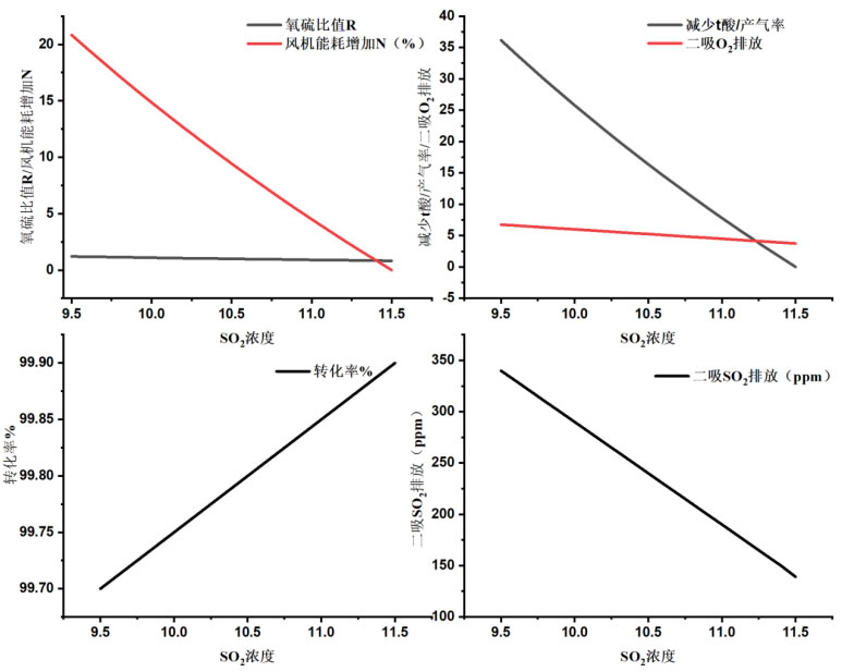 國內硫磺制酸裝置的設計通常設定在二氧化硫濃度f(SO2)為11.5%,這對應著一個特定的氧硫比值R=0.824。然而,每套裝置的理想氧硫比值實際上取決于裝置的特定屬性,包括所使用的催化劑類型、轉化器的氣體流速、風機的壓力以及工藝流程等因素。這些因素最終決定了二吸塔出口的二氧化硫排放濃度。該排放濃度受轉化率的影響,而轉化率下降的主要因素是轉化器內氧含量的降低。因此,最佳氧硫比值的確定點是裝置經濟性能最優的時刻,此時裝置所需的最小氧量(空氣)與硫的比值即為最佳氧硫比值。圖2展示了裝置轉化率的環保經濟性與裝置能效之間的對應關系,每套裝置都可以根據自身的特性來選擇最適宜的氧/硫比值R。