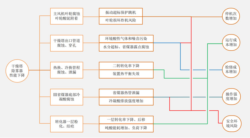 當干燥塔除霧器帶酸時,會造成下游管道和設備腐蝕(包括夾帶酸對下游風機葉輪的磨蝕),因此制酸裝置開車率必然會下降。下游冷熱換熱器的反復封堵會使受限空間的作業次數增多,也增加了安全風險。[1]