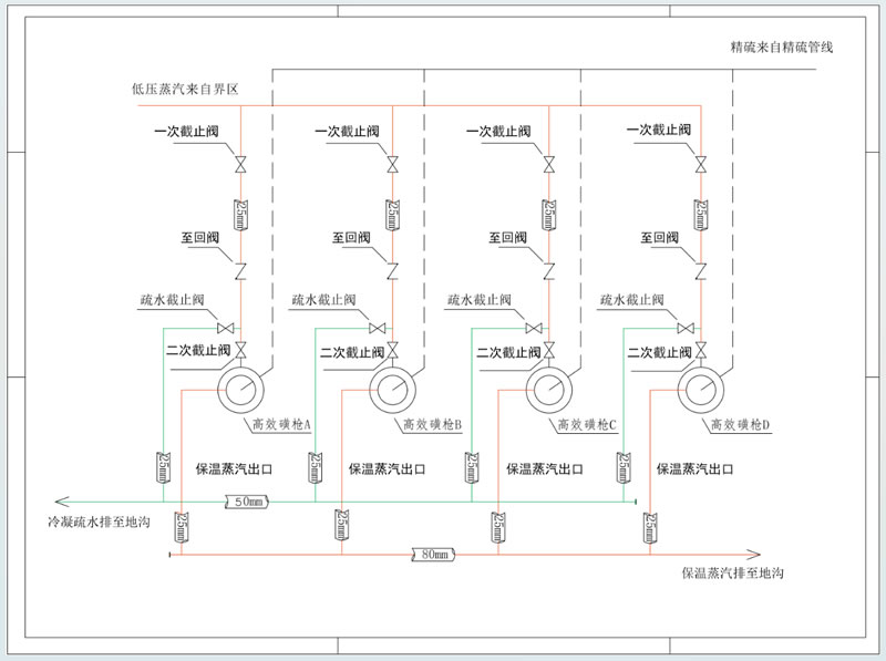 1、應先打開保溫蒸汽進口前的疏水截止閥,把保溫蒸汽內的冷凝水排干凈,以保證進入磺槍的保溫蒸汽內不含有冷凝水;