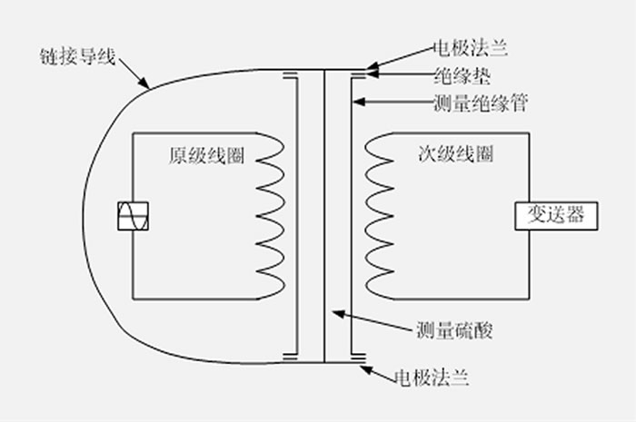 電導率傳感器由探測頭、信號電纜、溫度補償熱電偶、測量管及其連接法蘭組成;探測頭采用兩個線圈,一個作為發送器,另一個作為接收器,利用保護盒將環境和過程液體完全隔離。當發送器線圈通電,硫酸導電產生感應電流,感應電流與硫酸的電導率成正比,接收器線圈檢測電流的大小由信號電纜輸出到變送器,從而計算出硫酸的濃度;由于高溫硫酸具有強腐蝕性,加上絕緣材料無法承受高溫,兩個線圈不能直接浸入接觸硫酸,所以測量探頭安裝在襯有聚四氟乙烯的測量管上;為了能正常運行使用,需要把傳感器兩端的電極法蘭用導線接通,當硫酸流過測量管時,形成一個導電回路,如圖1所示。