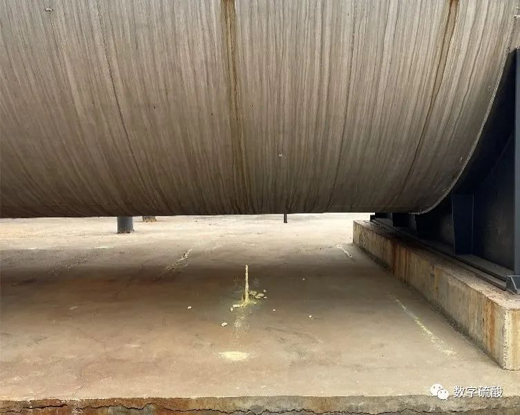 液體硫黃在沒有霧化的狀態下,自由燃燒速度平均為15.6 kg/(m2·h)。當焚硫爐底部有液體硫黃燃燒時,運行溫度會超高。為了避免爐內因溫度升高體積膨脹,產生內應力使爐體變形,或使砌體擠碎、拱起,在砌筑焚硫爐時都會留有膨脹縫。設計時在焚硫爐筒體爐墻與前端墻、后端墻之間分別留設了20 mm膨脹縫。擋墻被砌入耐火磚內層,每堵擋墻兩側分別留有膨脹縫,并且還在砌筑時設置了若干條10 mm膨脹縫,以保證總的膨脹量。流淌的液體硫黃會從底部的膨脹縫流進保溫層內緩慢燃燒。焚硫爐鋼殼的操作溫度一般為45 ℃左右,由于硫黃在保溫層與鋼殼中間燃燒的熱量無法向爐內傳遞,只能向環境傳遞,導致焚硫爐鋼殼的實際溫度達到150~170 ℃,SO2在鐵的催化下與氧氣反應生成SO3把鋼殼焊縫腐蝕穿孔。由于鋼殼與保溫層中間缺少空氣,液體硫黃燃燒緩慢,未燃燒的硫黃以升華硫的形式從腐蝕穿孔的位置流出,在焚硫爐下方形成硫黃鐘乳。
