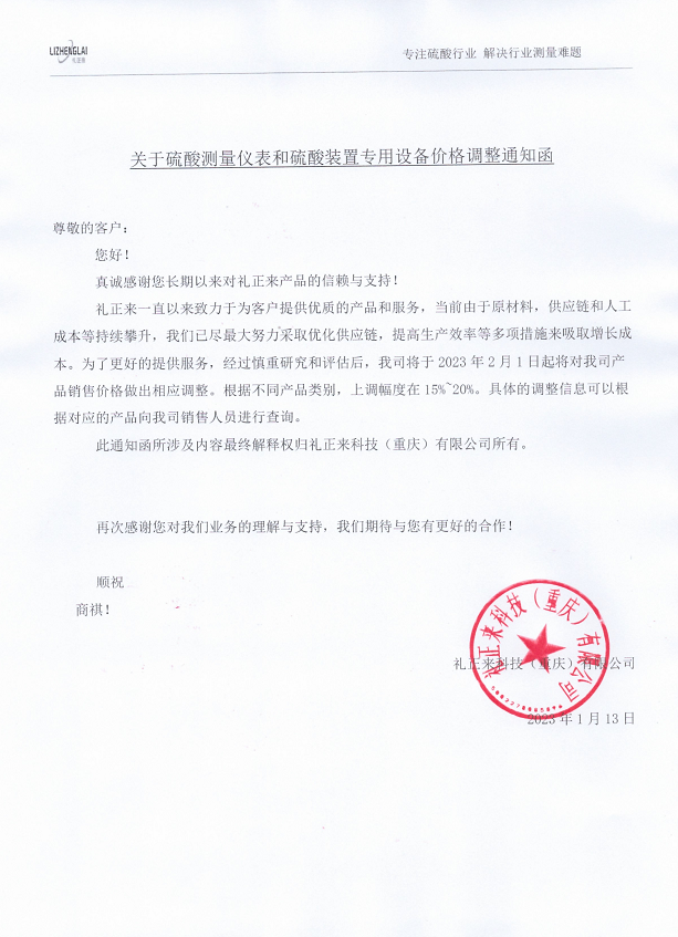 關(guān)于硫酸測(cè)量?jī)x表和硫酸裝置專用設(shè)備價(jià)格調(diào)整通知函